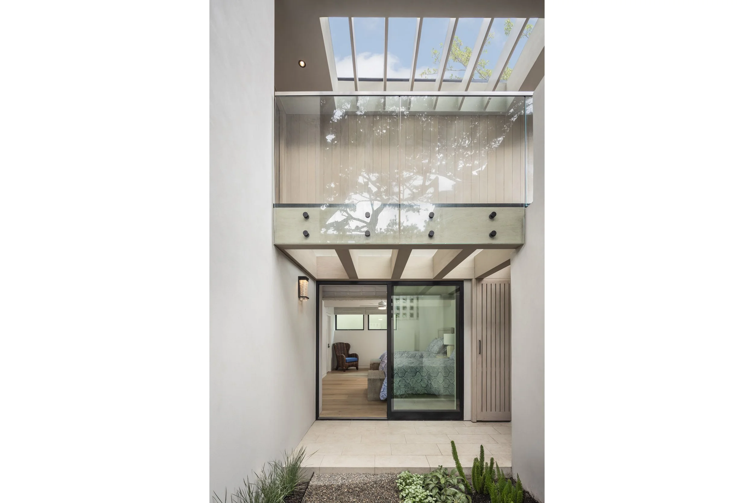 The original dark covered entry was replaced with a glass entry bridge and skylight to bring natural light into the home. This glass bridge also permits light down into the lower level bedroom.